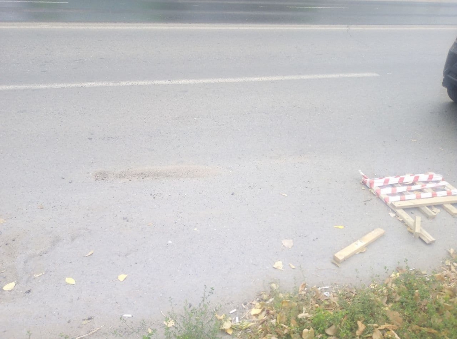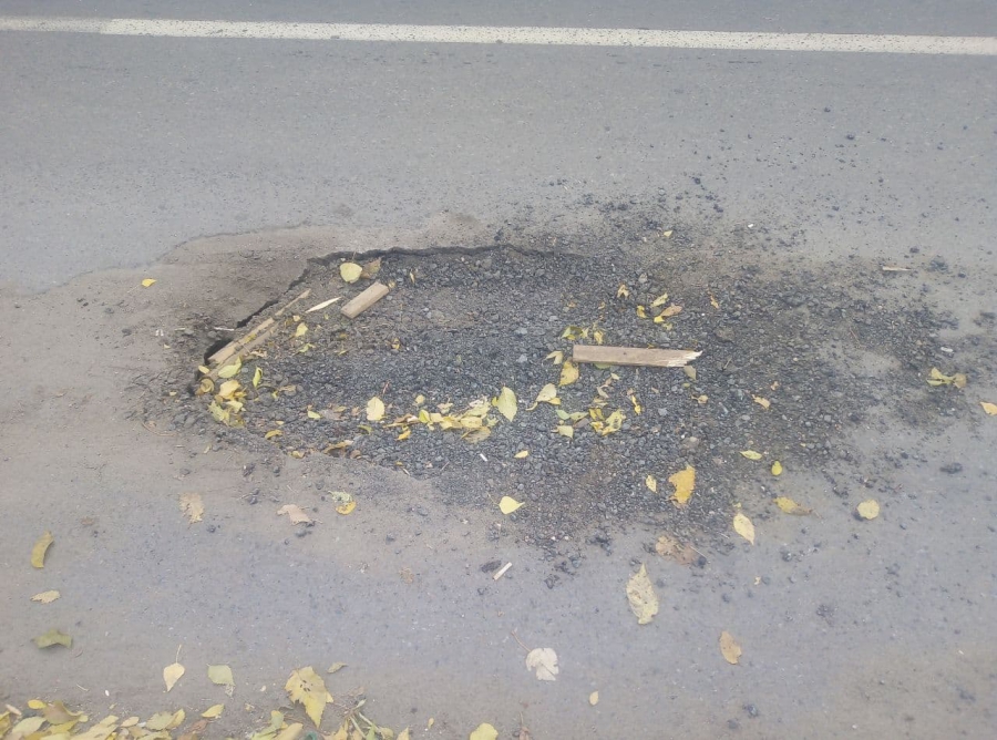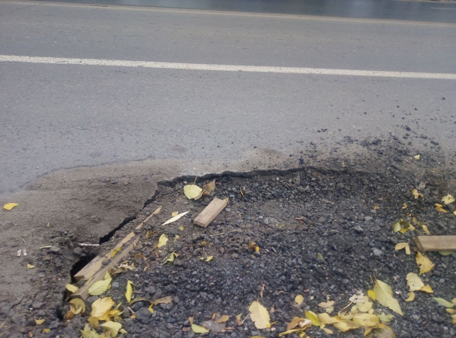 На данный момент разбитое деревянное ограждение не убрали с проезжей части, а на двух отсыпанных провалах материал просел, и ямы снова вернулись. Кроме этого движение автотранспорта затрудняет глубокая просадка, которая дополнительно свидетельствует о серьезных разрушениях в основании дороги.