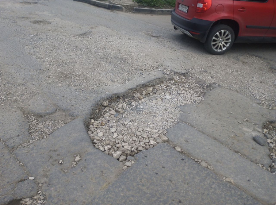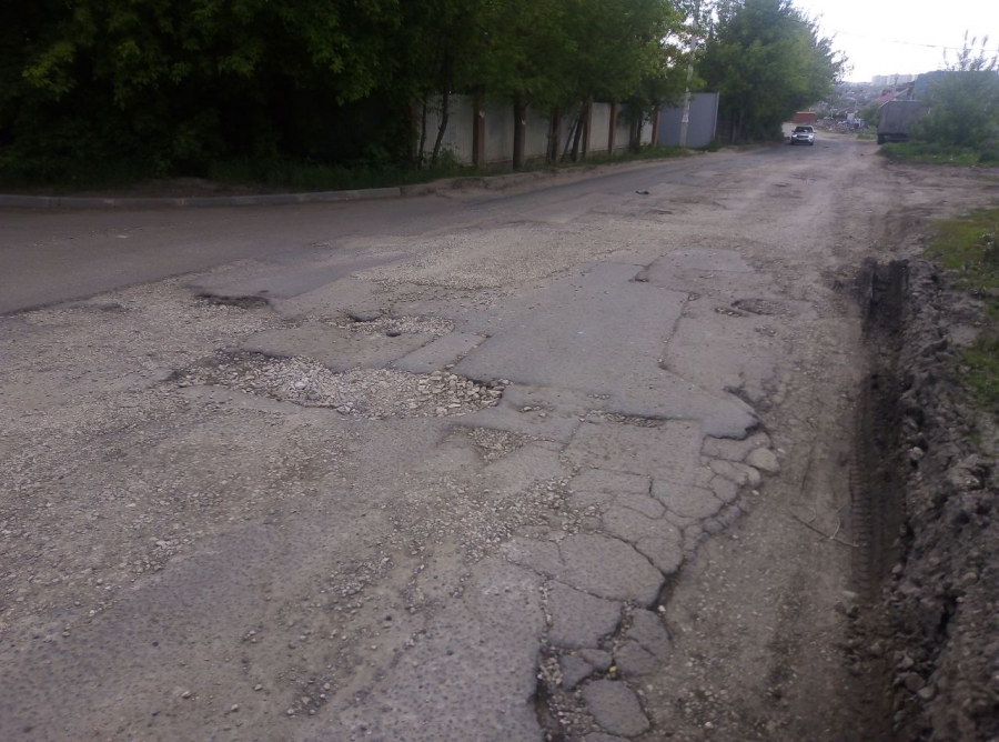 Глубокие выбоины и ямы заставляют водителей двигаться на минимальной скорости и объезжать многочисленные препятствия.