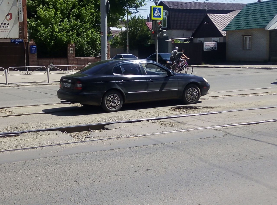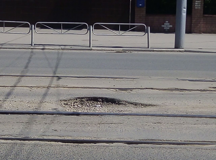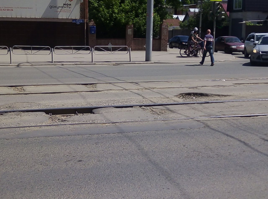 На улице Танкистов, перед пересечением с улицей 1-й Садовой на межрельсовом пространстве образовались глубокие выбоины.