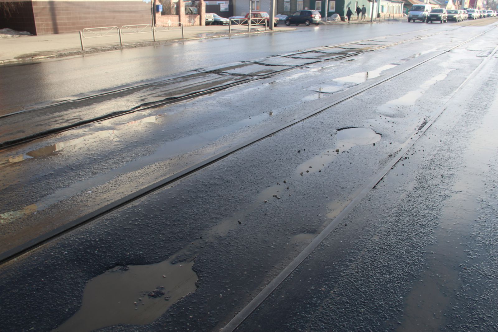 Разрушения покрытия появились и на пересечении с улицей 1-я Садовая, в этом месте выбоины образуются на межрельсовом пространстве, с которого осуществляют поворот автомобили.