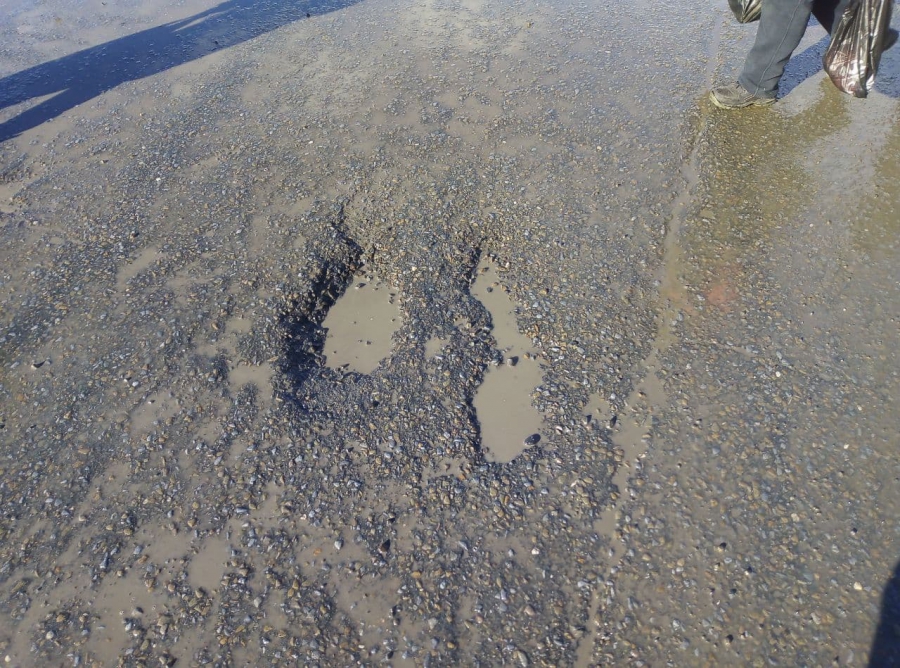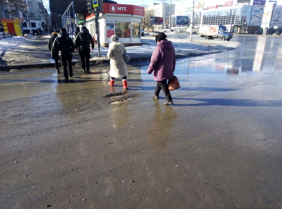 Угодив в такие выбоины, машины могут окатить брызгами пешеходов, которые ожидают разрешающего сигнала светофора на пешеходном переходе.