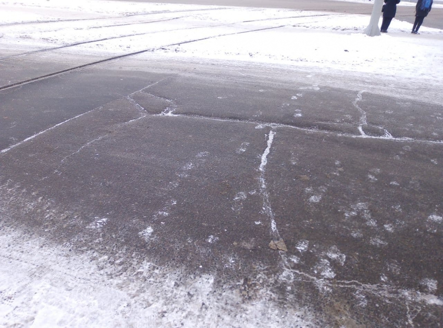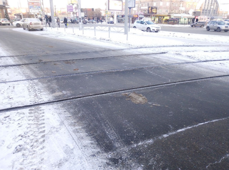На дороге для разворота по улице Большой Горной, рядом с пересечением с улицей Танкистов, образовались выбоины, а также неровности на пересечении с путями трамвая №3.