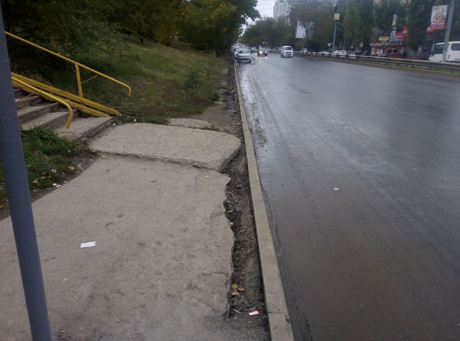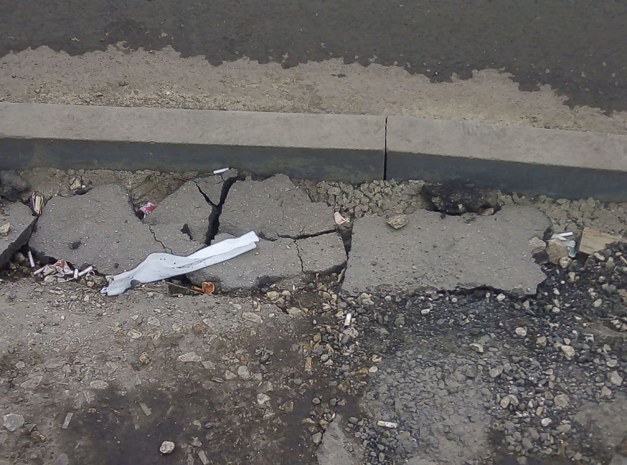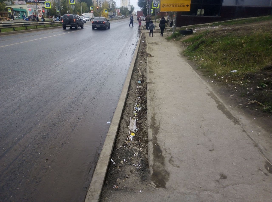 Между дорожным бордюром и пешеходной зоной образовалась глубокая канава, в которую могут угодить пешеходы, что, в свою очередь, может привести к травмам и падению на проезжую часть.