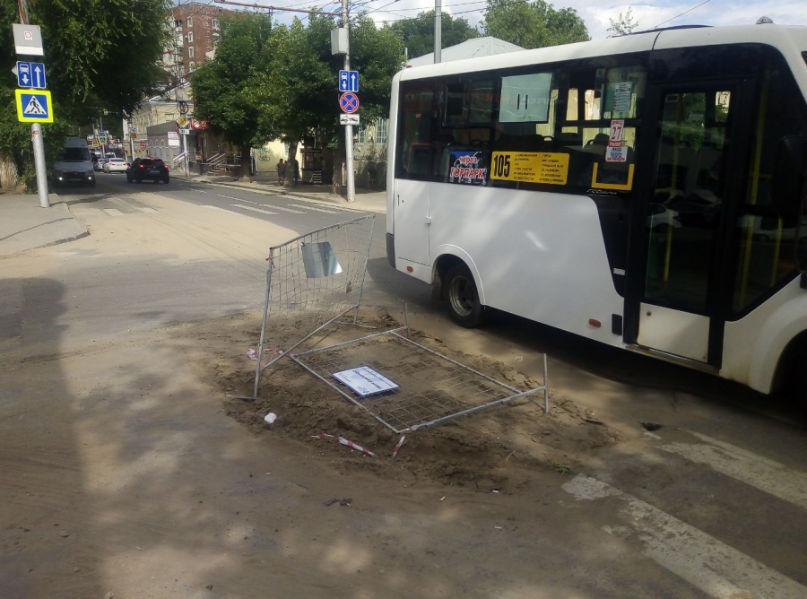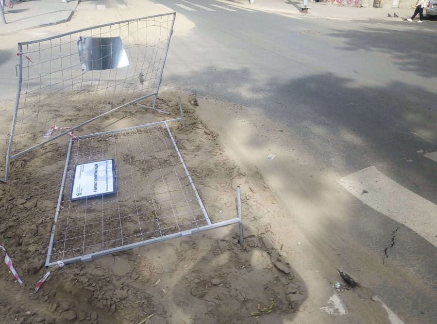 Яму, полностью перекрывающую полосу общественного транспорта, засыпали песком, при этом ограждение повреждено или повалено. От края раскопа по асфальту идут трещины, проседает асфальт, что может предварять дальнейшие разрушения покрытия.