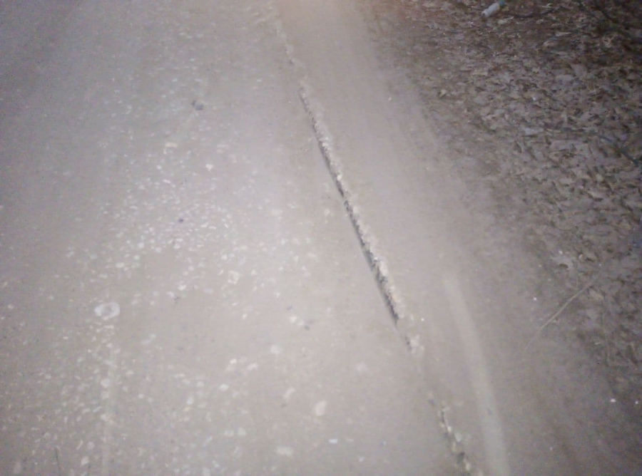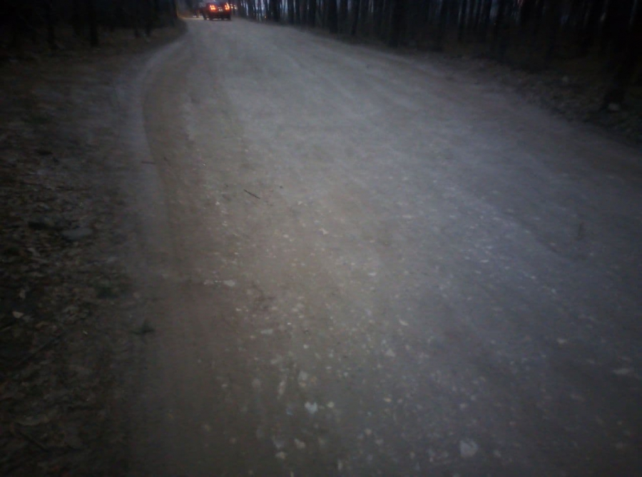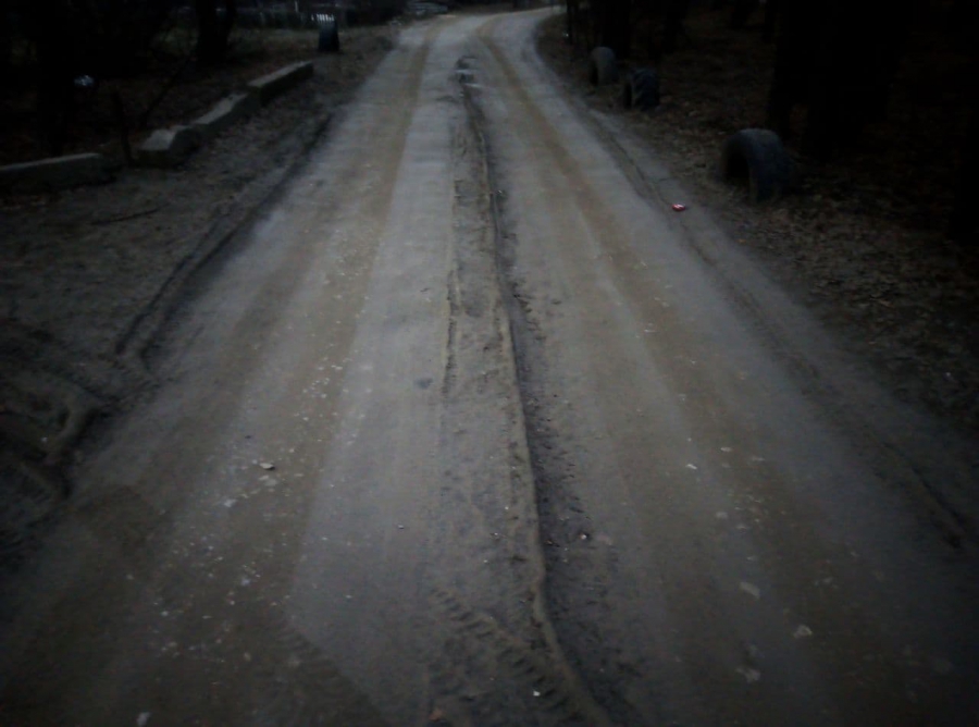 Дорога отсыпана щебнем и покрыта выбоинами и ухабами. О том, что на ней ранее было твердое покрытие, можно предположить по остаткам бортового камня, который уцелел и выступает по краям дороги.