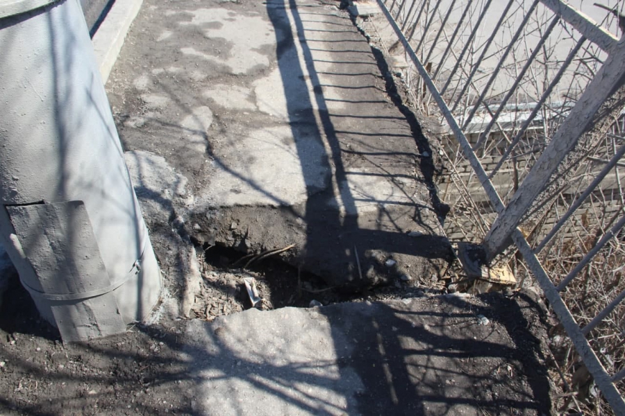 Сам тротуар испещрен ямами, из-за чего маломобильным саратовцам передвигаться по нему совсем не возможно, а остальные пешеходы рискуют получить травмы. К тому же край моста обваливается, обнажив арматуру и образовав значительный зазор между тротуаром и перилами.