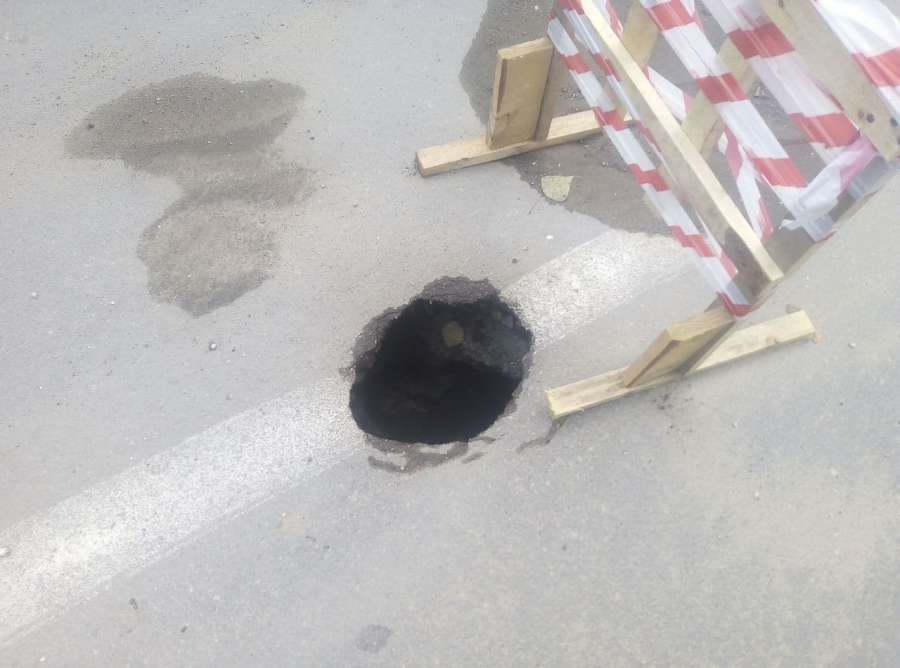 Провал расположился по центру проезжей части и уходит глубоко в основание дороги. На этом месте ранее проводились вскрышные работы и можно предположить, что повторная авария на коммуникациях размывает основание и в любой момент яма может значительно увеличиться в размерах.
