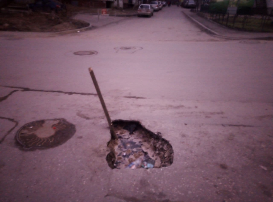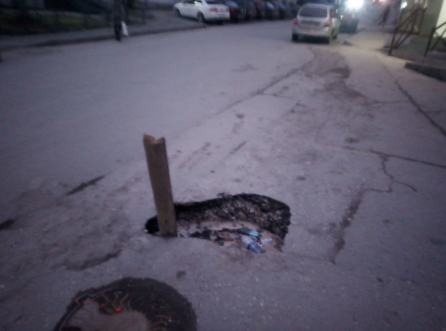 Яму обозначили воткнутой палкой, которая в темное время суток почти не заметна.