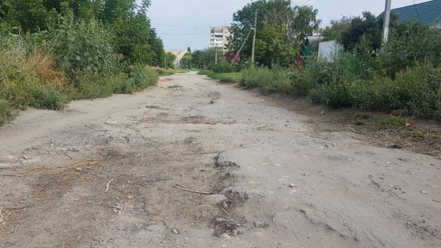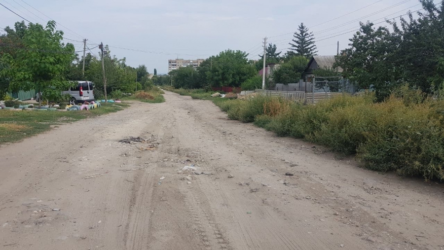 Остатки асфальта еще проступают на проезжей части сквозь толстый слой земли и пыли. Жители большого массива частного сектора вынуждены добираться к своим домам по полностью разрушенной дороге, которая в дождливый сезон утопает в грязи.