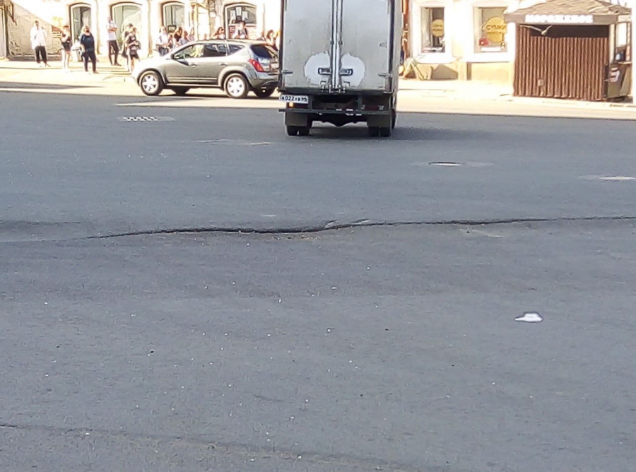 Еще одна глубокая просадка, также на месте вскрышных работ, образовалась по соседству, на пешеходном переходе у дома №45 по улице Радищева. Яма может в ближайшее время превратиться в провал и затрудняет движение в сторону улицы Московской.