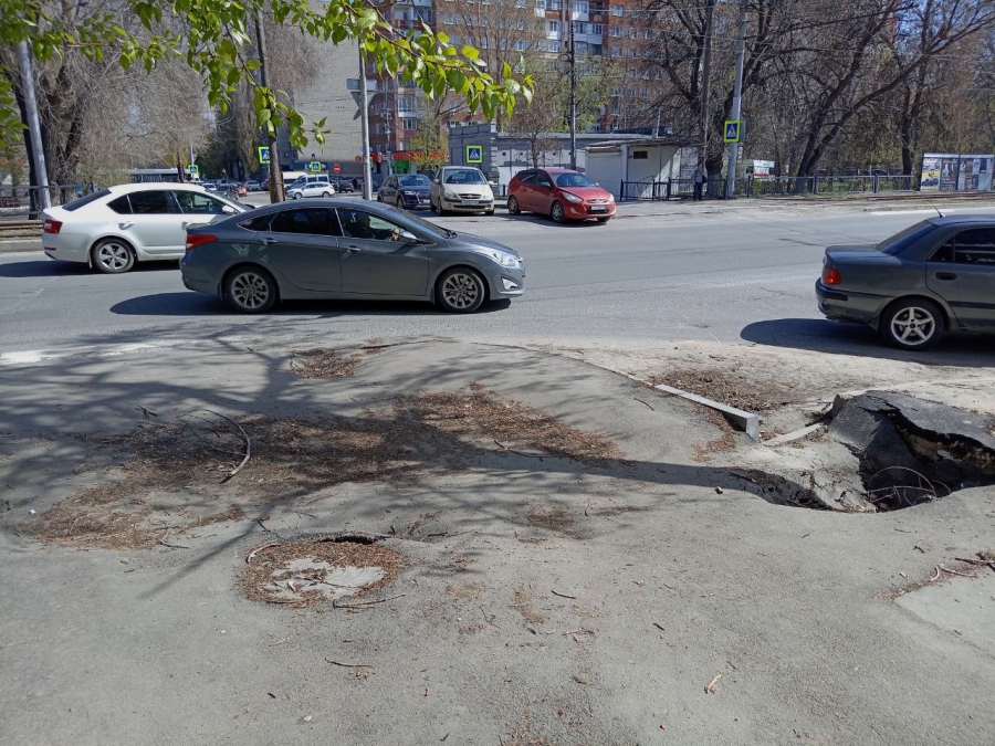 На улице Астраханской, на пересечении с улицей Посадского, проседает пешеходная зона. Просадка заняла весь подход к пешеходному переходу, а по краям ее образовалось несколько провалов.