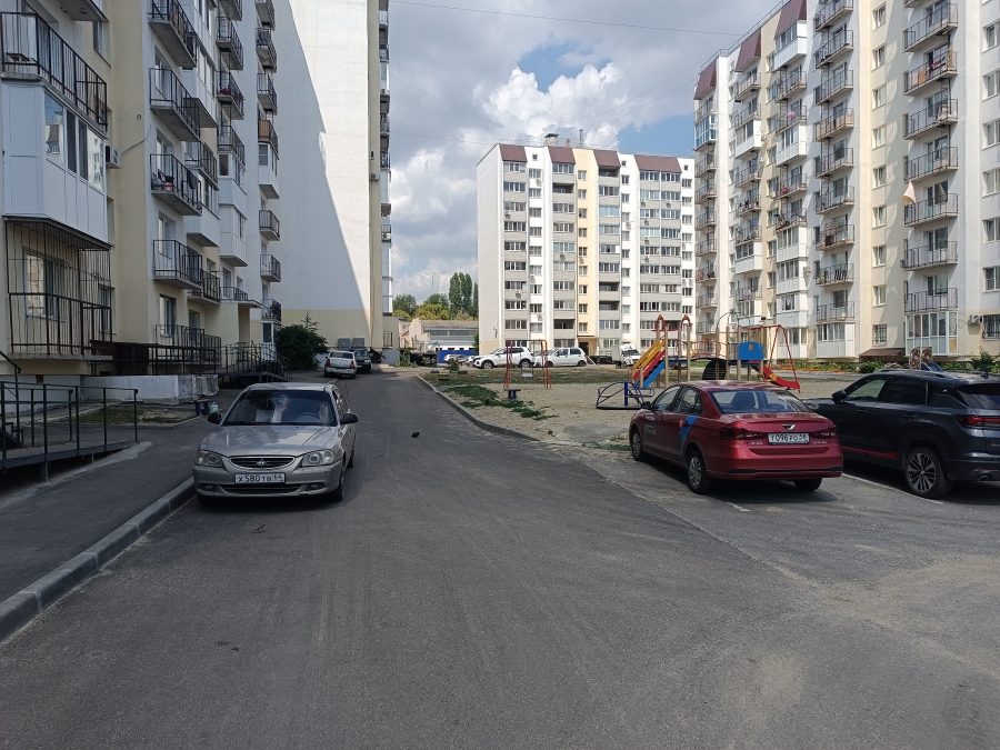 Каждый подъезд этого нового дома, построенного в 2020 году, обустроен пандусами, однако от тротуара к дворовому проезду нормативно не устроено ни одно занижение. Вместо положенных 1,5 сантиметров, высота занижений доходит до 7. Данное нарушение встречается абсолютно у всех подъездов многоэтажки.
