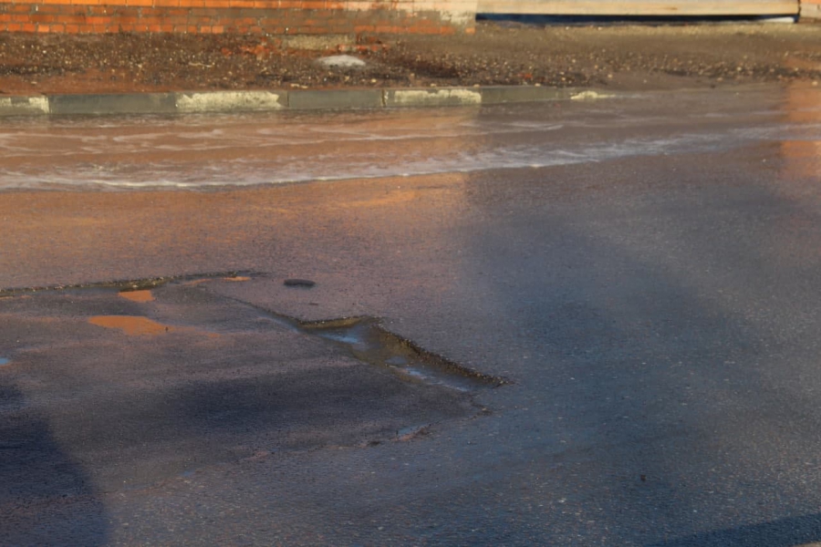 Почти половина дороги по направлению движения в центр города была переложена. Состояние восстановленных участков покрытия не выдерживает критики, появились выбоины и просадки, а в двух местах и вовсе асфальт трескается, обнажая пустоты, — один из признаков будущего провала.