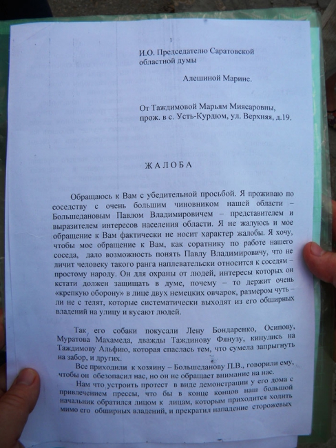 Обиженная сторона — соседи Большеданова с улицы Верхней в поселке Усть-Курдюм Саратовского района. Рядом с ними уже больше восьми лет обитает известный в регионе политик. Жили бы и жили, но, по словам семьи Таждимовых, чиновник не хочет считаться с соседями.