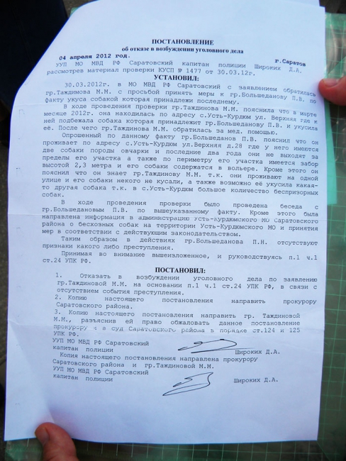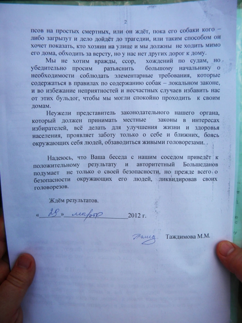 Жители улицы предоставили «Резонансу» коллективное обращение к тогдашней и. о. главы регионального парламента Марине Алешиной с просьбой подействовать на коллегу-депутата. По непонятным причинам в думе отказались принимать жалобу встревоженных граждан. Тогда семья Таждимовых обратились в правоохранительные органы. Через некоторое время оттуда, как и предполагалось, поступила отписка с пояснением Большеданова. Тот заявил полицейским, что уже два года не выпускает своих питомцев. «Принято решение об отказе в возбуждении уголовного дела» — такой формулировкой окончилась проверка.