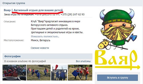 Группа в социальной сети «ВКонтакте», предлагающая «активный отдых для детей»