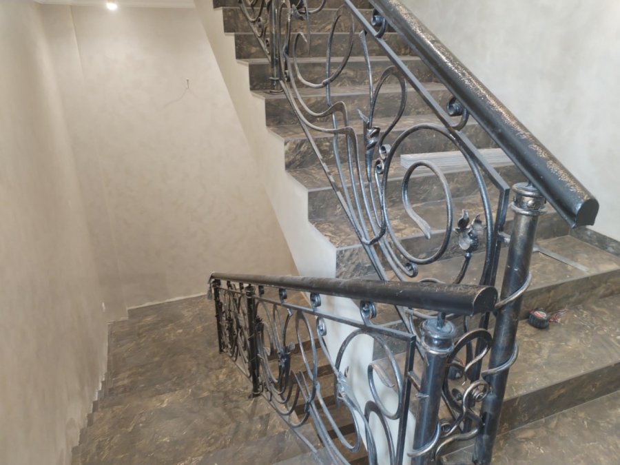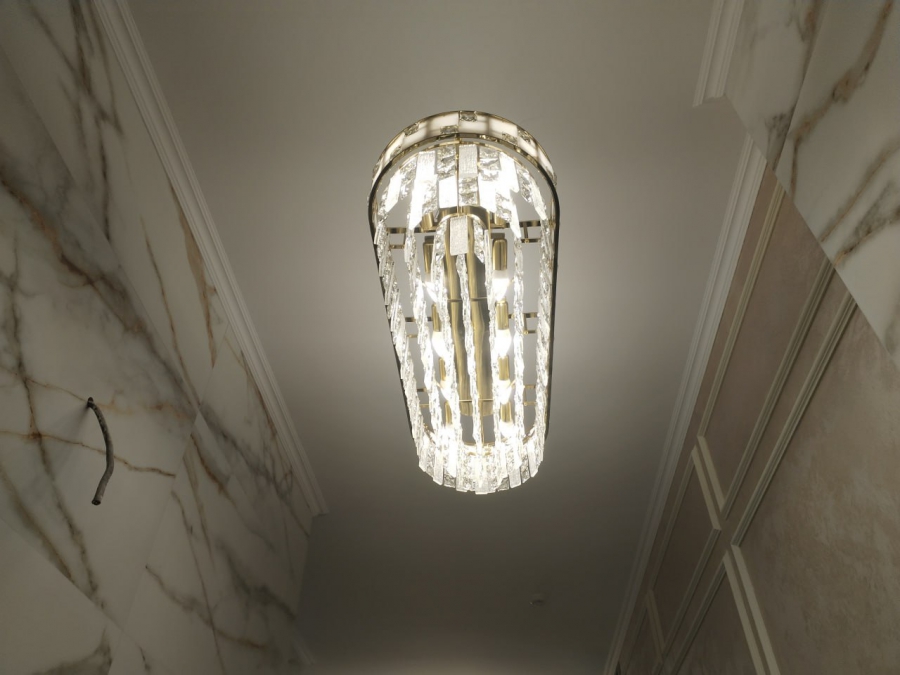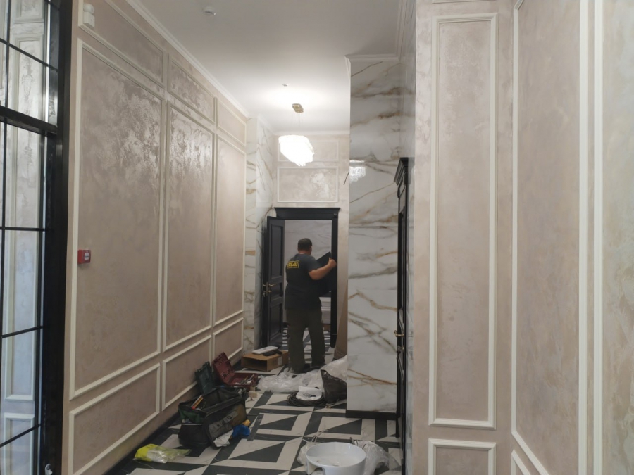Отделка здания изнутри выполнена в той же светлой пастельной гамме, лишь в оформлении стен и лестниц используются отдельные серые плитки из искусственного мрамора. Люстры в холлах и на лестнице стилизованы под хрустальные. Они похожи на старинные, но при этом в них просматриваются современные мотивы.