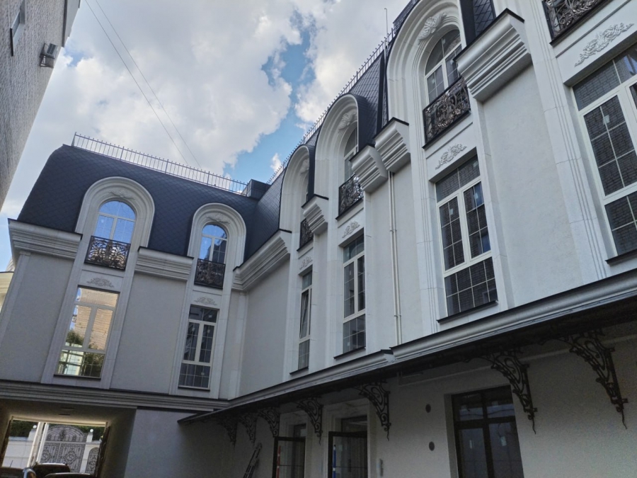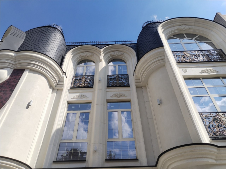 Также фасад строения украшен лепными элементами под старину. При этом их немного. Ровно столько, чтобы придать дому изюминку и подчеркнуть его общую эстетику.