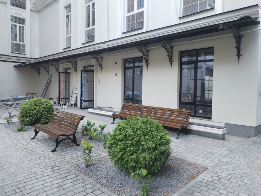 По периметру здания высажены декоративные растения и расставлены вазоны для будущих цветов. Небольшой зеленый уголок со скамейками разбит во дворе. Также к зданию примыкает участок с гостевой парковкой.