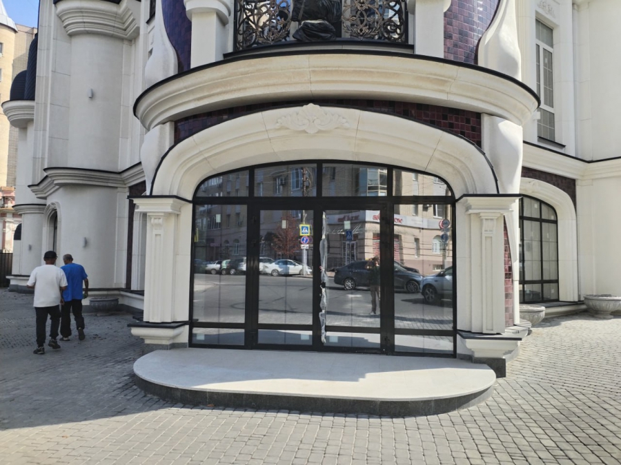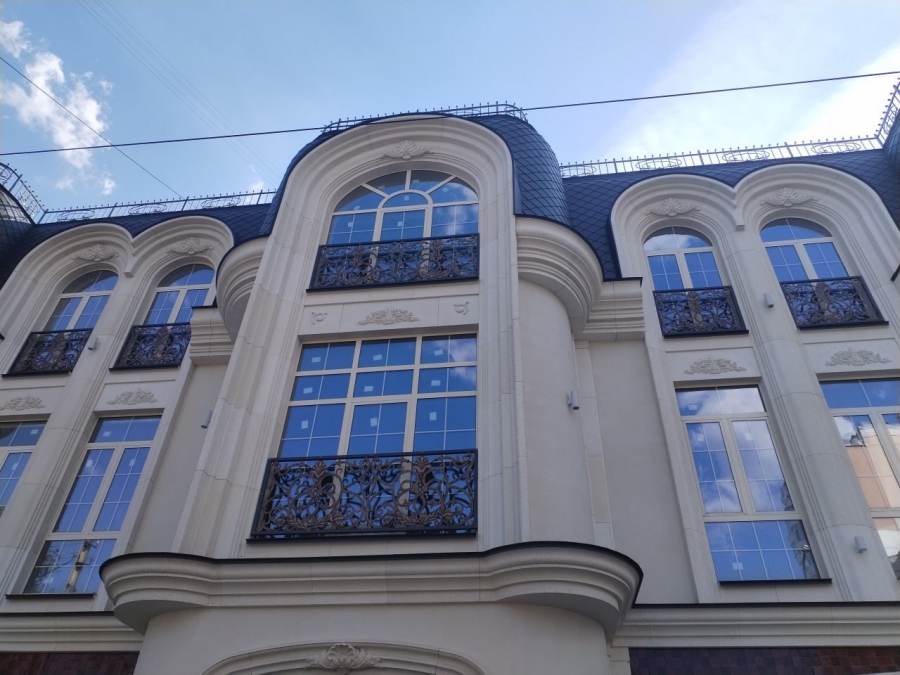 Дом облицован изразцами в бордовой гамме. Сам фасад осветлили. Само здание окрашено в пастельный цвет ближе к молочному. На нем много декоративных мощных решеток – они кованные (этот элемент декора теперь редко используется, разве что в столице) и полностью вписываются в общий архитектурный контекст места.