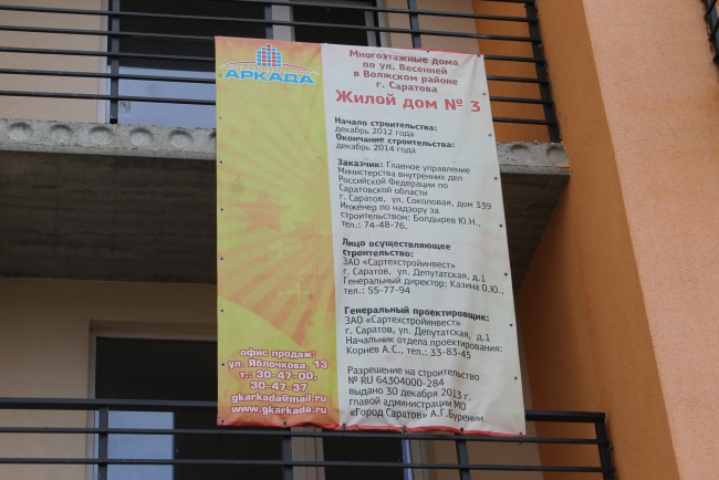 Отметим, что застройщиком дома выступает ГУ МВД по Саратовской области, генподрядчик - ЗАО «Сартехстройинвест» (Группа компаний «Аркада»), руководитель Алексей Березовский, депутат гордумы и видный единоросс.