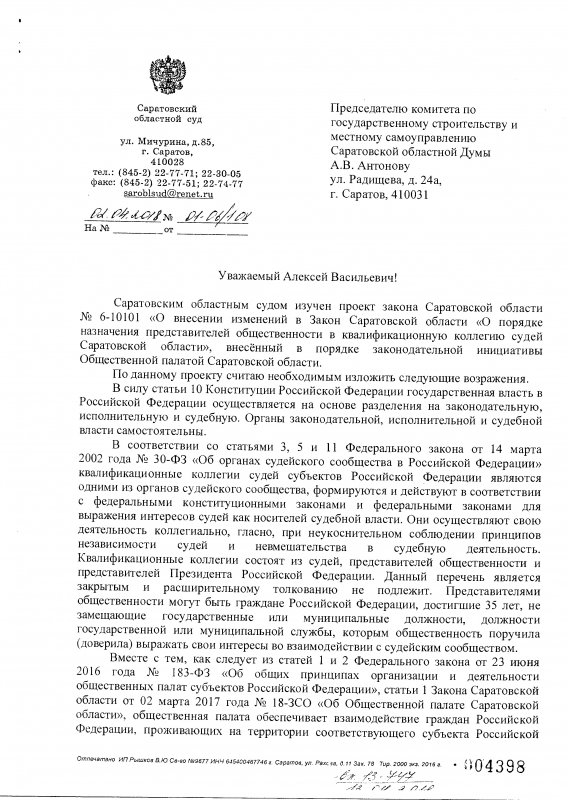 Развернутые заключения Саратовского областного суда и Управления судебного департамента в Саартовской области, направленные в областную думу, прикреплены к данному материалу.
