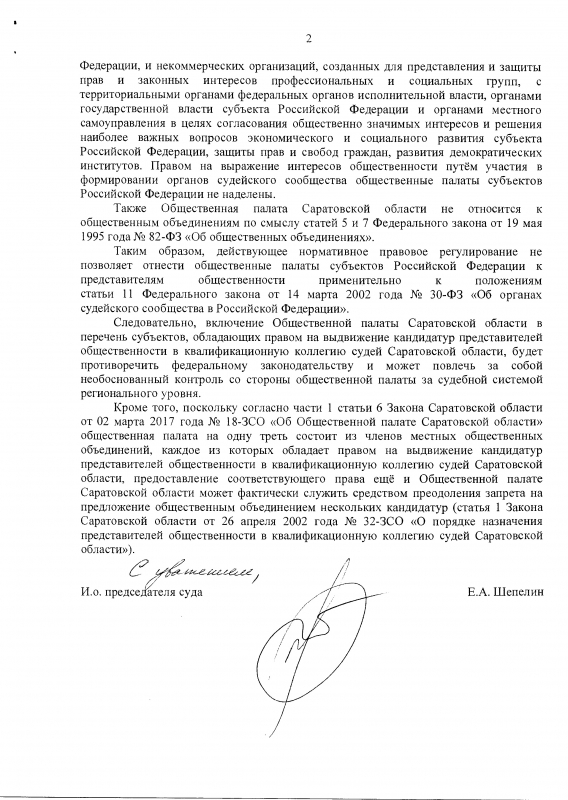 В ответе на запрос «Четвертой Власти» и.о. председателя Саратовского облсуда Евгений Шепелин пояснил, что, признавая значимость общественного мнения при формировании судейского корпуса, областной суд не возражает против участия в этом процессе Общественной палаты и выдвижении кандидатур в состав квалификационной коллегии судей.