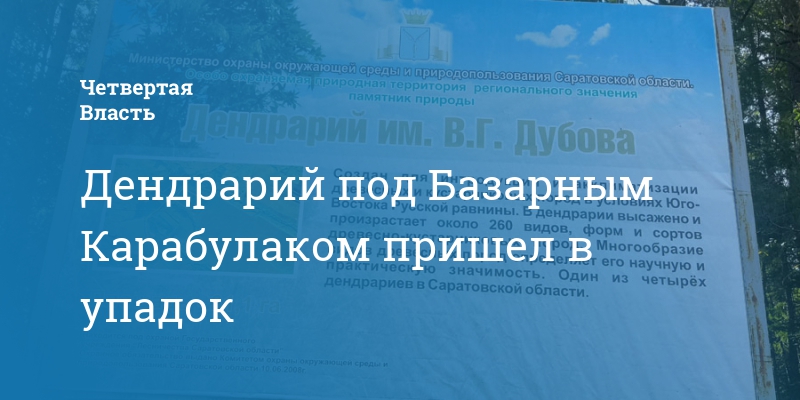 «Четвертая Власть» заинтересовалась состоянием дендрария и начала детально изучать ситуацию, в том числе направив официальный запрос в министерство природных ресурсов и экологии. Стоит отметить, что в Саратовской области не больше пяти подобных памятников природы. Общая площадь базарно-карабулакского дендрария составляет 31,1 га, из которых 12,5 га занимает непосредственно дендросад. В нем высажено и произрастает около 260 видов, форм и сортов древесно-кустарниковых пород.