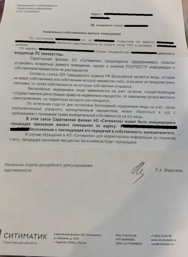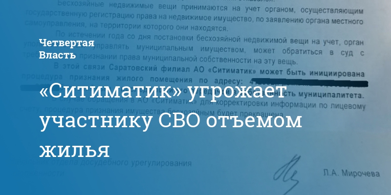 Из присланной в редакцию фотографии извещения следует, что регоператор не может самостоятельно установить собственника жилого помещения в одном из сел Саратовской области. На этом основании мусорные коммерсанты угрожают инициировать процедуру признания жилого помещения бесхозяйным с последующей его передачей в собственность муниципалитета. Проще говоря, обещают отнять жилье. Из следующего предложения следует, что данная процедура уже начата и будет прекращена в случае обращения в «Ситиматик» для корректировки информации по лицевому счету. По сообщению читателя, такие угрозы пришли в адрес собственника, который является участником СВО.