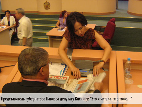Тут общий гул разрезал звонкий голос представителя губернатора в думе Ольги Павловой. «Людям уровня замминистра сидеть негде, зато они у нас…» - даже не удосужилась повернуться к нам лицом чиновница. В общем, Павлова вбросила мысль нелюдей-журналистов попросить покинуть помещение и рассадить лучше коллег по госслужбе. К ее счастью, Капкаев не принял радикальное решение. Кое-как расселись и начали заседание. Те, кто не поместился, пошли работать. А я задумал написать эту статью. Для чего стал внимательнее присматриваться к поведению участников заседания.