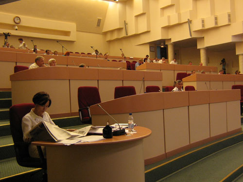 Заседания комитетов и рабочих групп проходят в думе в парламентском центре. Это такая комната примерно 20 на 10 метров. Народным избранникам, в принципе, достаточно. При одном условии: собираться там должно не больше 30 человек. И этому правилу они следуют почти всегда, но на упомянутом выше заседании комитета оно было нарушено. В тот день областной министр финансов Александр Ларионов рассказывал народным избранникам, какие они там в правительстве наворотили поправки в бюджет. Поддержать его пришли чиновники из других ведомств. По всей видимости, у них существует разнарядка: от такой-то структуры столько-то человек. В общем, количество мест и претендентов на них не совпадало.