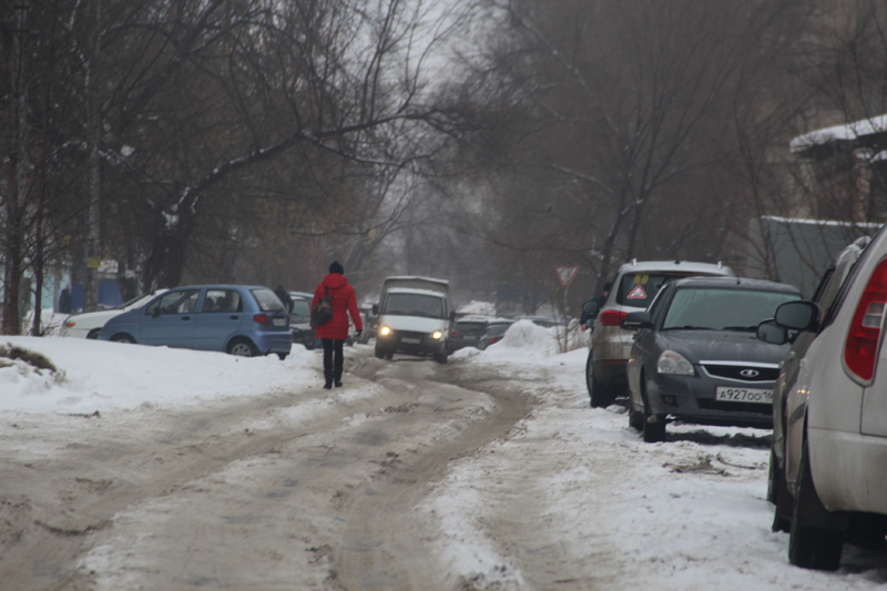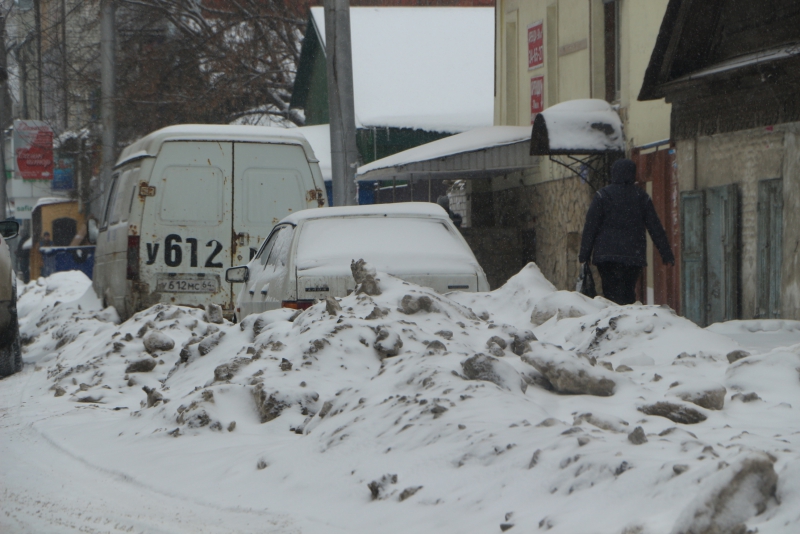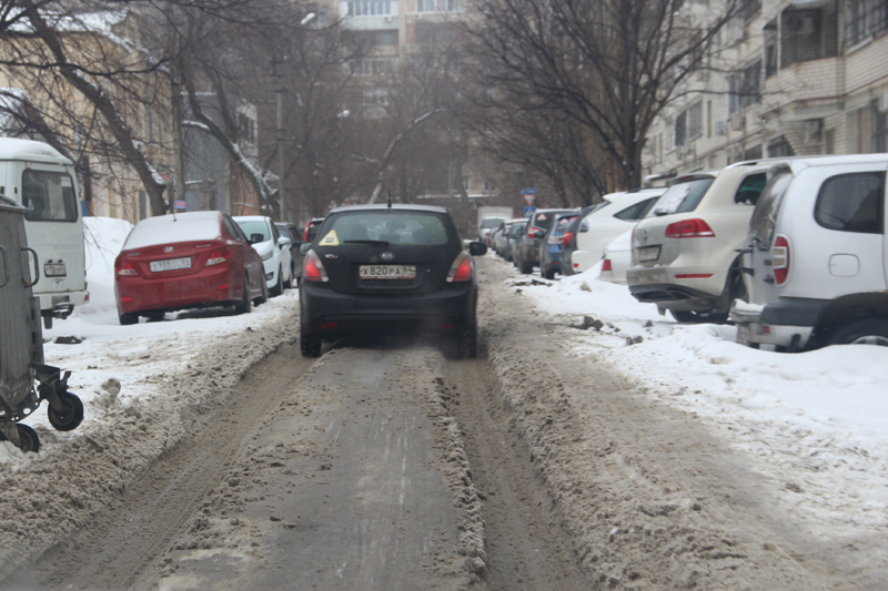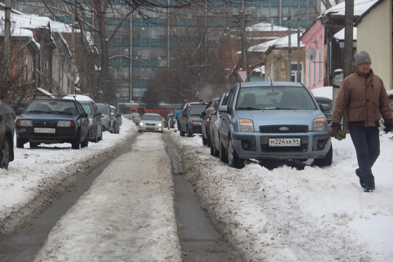 В целом же выпавший с утра снежок только ухудшил и без того печальную ситуацию на дорогах Саратова, которые сплошь стали односторонними из-за заледеневших сугробов по обочинам. Из-за того, что автомобили не могут ни нормально припарковаться, ни разъехаться, постоянно образуются мелкие пробки и ДТП. Особенно удручающая картина на Рахова, где сугробы «съели» целый метр дороги.