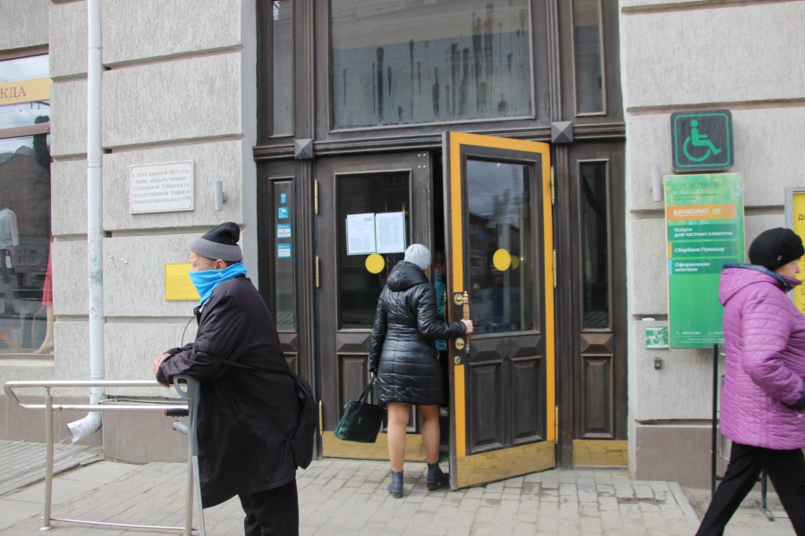 Последить за дистанцией решились в отделении на улице Горького. Там сбившихся в узком коридоре пенсионеров разгоняли на безопасные 1,5 метра, цитируя постановление Роспотребнадзора. Это же касалось всех тех, кто пробивался к вожделенным банкоматам. Всех, кто не поместился – попросили выйти на улицу.