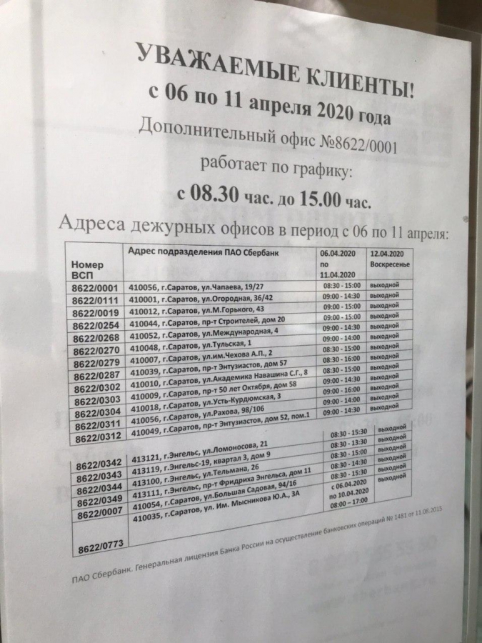 Между тем, по информации Сбербанка, в Саратовской области с сегодняшнего дня работает увеличенное количество офисов, общее число работающих филиалов составит 57. Всего же в Саратове должны работать 15 офисов по обслуживанию физических лиц; в Энгельсе - 4 офиса; в Балакове - 3 офиса; в Балашове – 2 офиса.