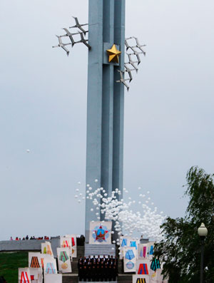 Торжества в честь годовщины победы над фашистской Германией проходили в Саратове по всему городу: на центральных площадях звучала музыка военных лет, можно было сделать «военное фото» или прокатиться на автобусе на бесплатную экскурсию. Но главные события происходили в тот день в Парке победы на Соколовой горе.