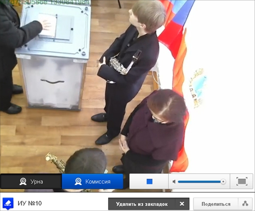 На участке №10 (школа №9) урны расположены вплотную к столу комиссии. Камера, направленная на урны, хорошо показывает один из ящиков для голосования, а второго на ней не видно вообще. На камере, направленной на комиссию, видна вторая урна, но избиратель полностью закрывает ее спиной во время голосования. На этом участке даже в наушники была слышна «живая музыка» – благодаря выступлению саксофонистов, расположившихся прямо под камерой.