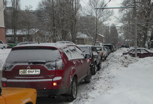 Второй способ очистки дорог ярко проиллюстрировала улица Челюскинцев, куда мы заглянули после того, как решили из Ленинского района проехать в центр города. По ней проехал автогрейдер, раскидавший снег с середины проезжей части по обочинам. Благодаря усилиям техники ширина дороги сократилась буквально до одной полосы, и автомобилистам приходилось постоянно уступать друг другу путь на особо узких участках. Кстати, немалую роль в пробках играют и водители, бросающие машины на обочине, тем самым оставляя еще меньше места для проезда. Один из таких нерадивых автолюбителей, припарковал свой «Рено Логан» буквально в нескольких метрах от нас, моментально создав затор. И здесь не помог бы даже гаишник, если бы даже он был поблизости. В Саратове некуда отгонять машины, остановившиеся в неположенном месте. Штрафстоянки у нас нет. Спасибо муниципалитету.