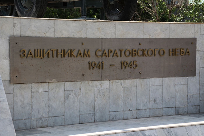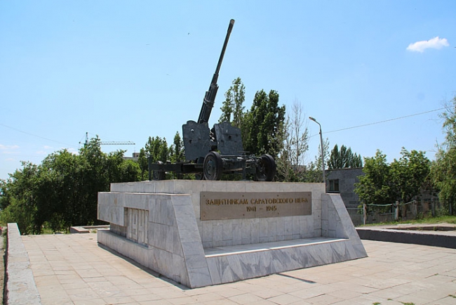 После этого корреспонденты побывали у монумента, установленного в память защитникам саратовского неба (район Улеши). На месте их встретили учащиеся соседней с памятником школы. Выстроившись перед зенитной установкой, дети принялись рассказывать историю создания данного мемориала. Оказалось, что в годы Великой Отечественной войны 720-й зенитно-артиллерийский полк охранял небо над Улешами. Фашистские самолеты бомбили Саратов иногда по несколько раз в день. На месте одного из расчетов, погибшего при защите саратовского неба, установлен памятный знак в виде 85-мм зенитной артиллерийской пушки на постаменте.