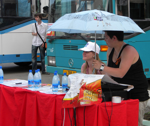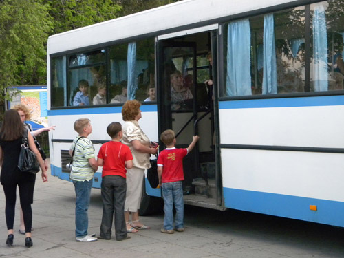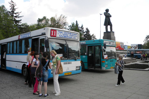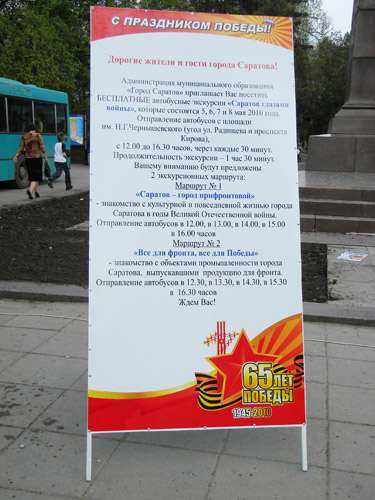 Для экскурсий по городу администрация города выделила несколько автобусов, снятых с маршрутов №90 и №11. Транспорт отъезжает от памятника Н. Г. Чернышевскому каждые 20-30 минут, а сидящие за столиками девушки в мегафон призывают прохожих посмотреть на Саратов времен войны. Основные пассажиры автобусов – молодые парни и девушки. К автобусу они подходят стройными рядами, часто в сопровождении людей средних лет, отсюда можно сделать вывод, что эта поездка – не их инициатива. Эту догадку подтвердил студент СГАУ им. Вавилова Саша. На вопрос, заставили ли его прийти сюда, он честно ответил: «Типа того». Всего по данным администрации только за вчерашний день в исторических экскурсиях приняли участие более 400 человек.