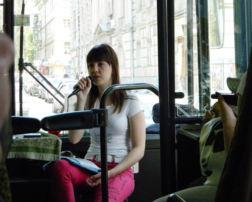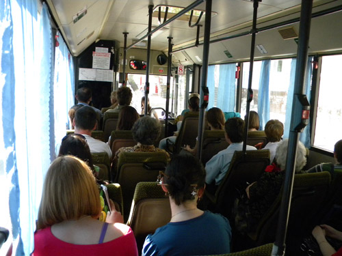 В роли гида выступила студентка института истории и международных отношений СГУ им. Н.Г. Чернышевского по имени Марина. Несмотря на волнение, она довольно живо рассказывала об истории города. Через полчаса поездки стало понятно, что автобусы с наглухо закрытыми окнами плохо подходят для полуторачасой экскурсии, когда температура на улице превышает 28 градусов. Пассажиры обмахивались платками и кепками, и поначалу даже не смотрели на проплывающие мимо них исторические здания. Женщина с маленьким ребенком, видимо, не выдержав духоты, попросила высадить ее в центре. Но затем на улице стало прохладнее, и на лицах людей появилась заинтересованность.