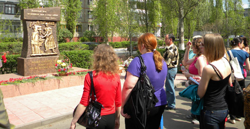 Участники экскурсии дважды выходили из автобуса: к открытому только вчера на 2-й Садовой памятнику труженикам тыла и к памятнику героям-жителям Октябрьского района. Причем, каждый раз после выхода число пассажиров уменьшалось на 5-6 человек. Завершилась экскурсия у Консерватории, которая, по словам гида Марины, первые два года войны называлась московской Консерваторией им. П. И. Чайковского, т.к. туда были эвакуированы столичные музыкальные педагоги.