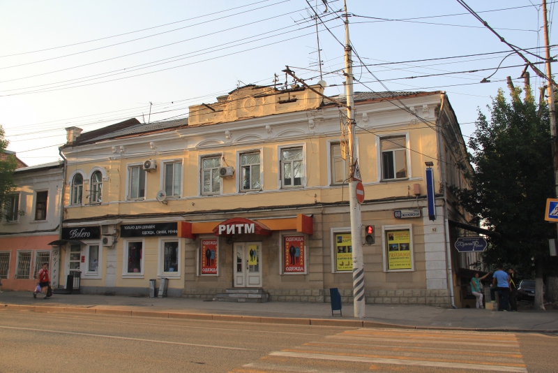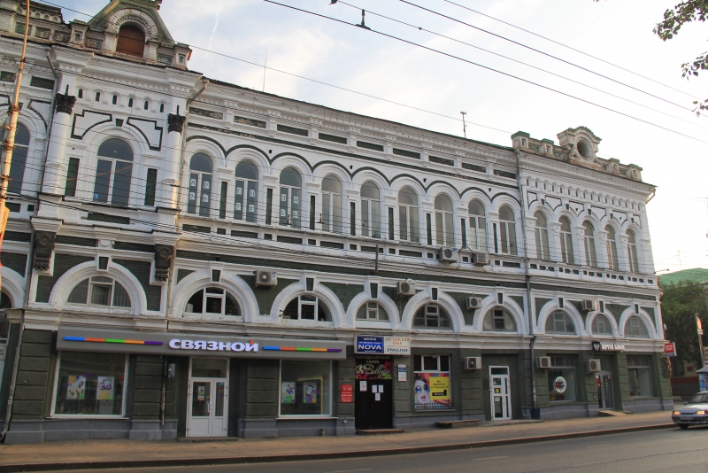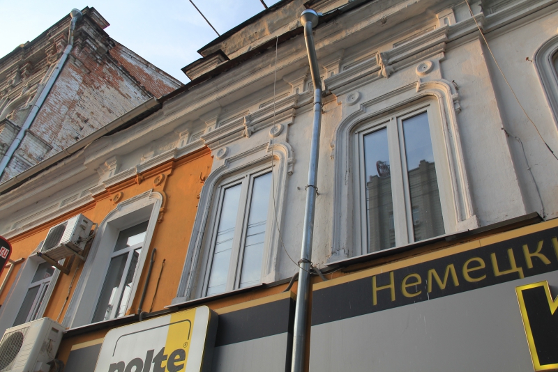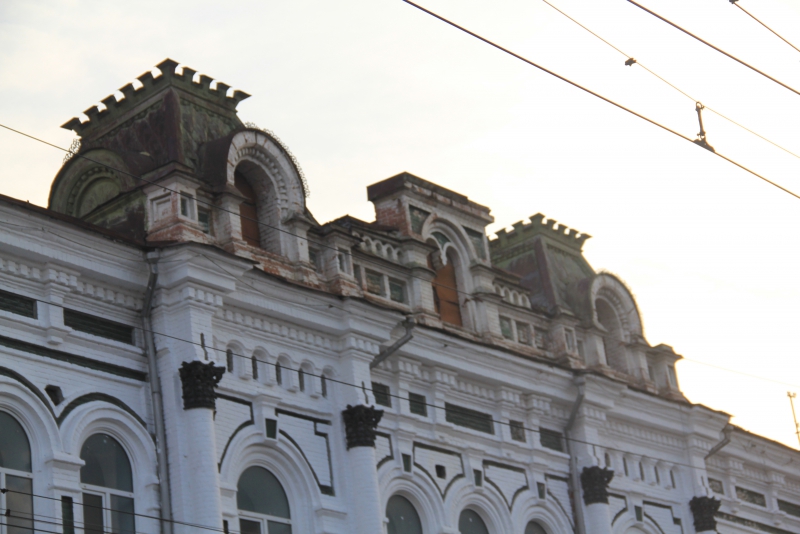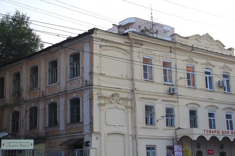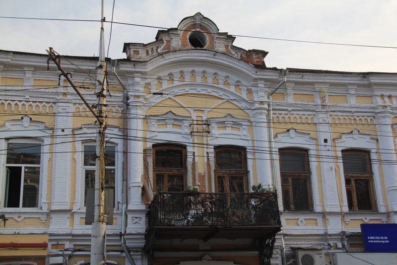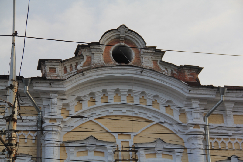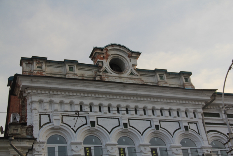 Пожалуй, самый выигрышный вид после покраски обрело бывшее здание торгового пассажа Лаптева (угол Московской и Радищева). Оно выделяется среди своих соседей на центральной улице города. Правда, и здесь не обошлось без изъяна. У тех, кто приводил здание в порядок, руки не дошли до крыши, и ее некрашеная верхняя часть выглядит диссонирующим элементом.