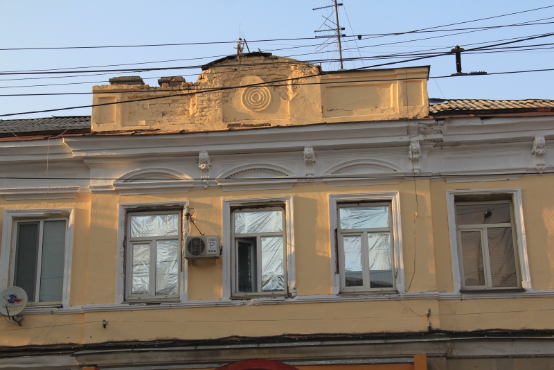 Такая же «картина» на фасаде дома №46. Только здесь на втором этаже не удосужились даже окрасить кирпичную кладку.