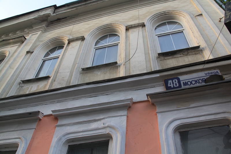 Дом №60 на Московской оказался покрашенным сразу в три оттенка бежевого цвета. Непонятно, по каким принципам выбирался цвет краски, и кажется, что восторжествовал принцип – кто во что горазд. Причем в верхней части краску нанесли на кирпичи, с которых давно уже облетела штукатурка. Такое отношение напоминает ремонт, который производили на домах по улицам, где пролегал маршрут движения кортежа премьер-министра Дмитрия Медведева. В частности, был окрашен без проведения ремонта в странный розовый цвет фасад усадьбы Тюльпина на улице Чернышевского.