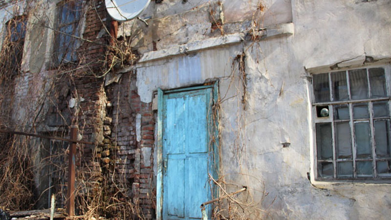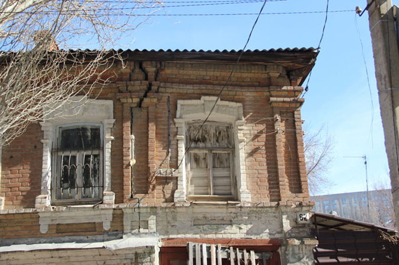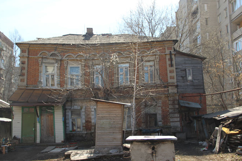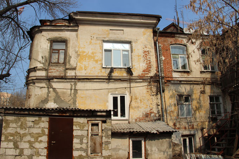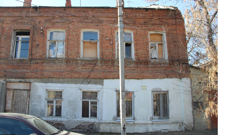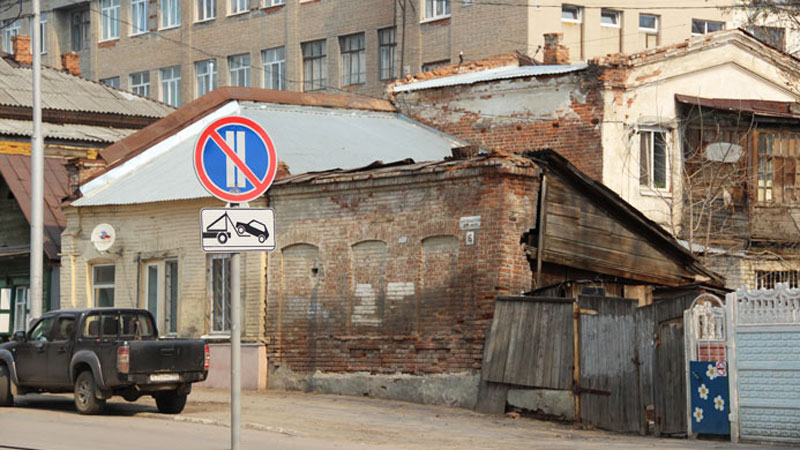 10. Многочисленные трещины, разломы фасада, обрушившаяся вместе со штукатуркой кирпичная кладка под крышей испещряют стены расположенного неподалеку дома №168 по Чернышевского. Что примечательно, растянувшийся в его дворе одноэтажный полуразвалившийся барак оказался местным домоправлением одной из высоток неподалеку.
