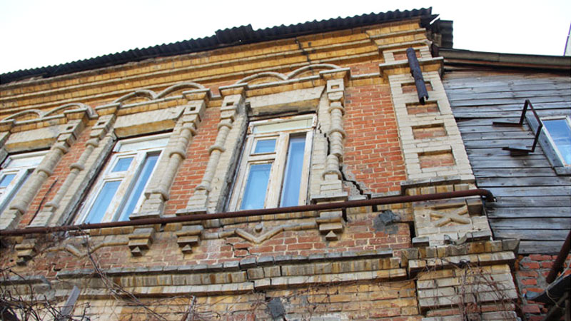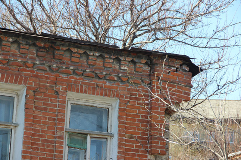 4. Тревожное чувство вызывают сразу 3 дома, расположенные друг за другом по Валовой. В доме №77 фасад испещрен трещинами, под крышей уже отсутствует ряд кирпичей.