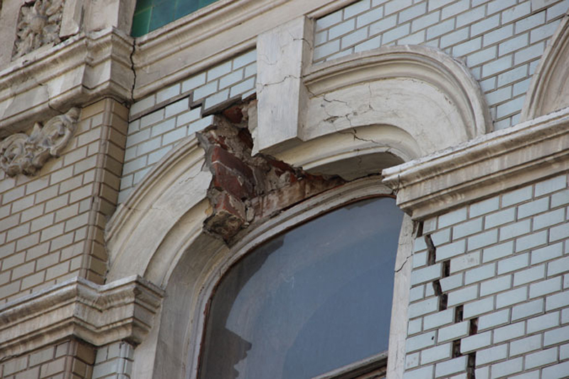 7. Не меньшую опасность являют собой стены фасада дома №4 по Тулупной. Отвалившаяся здесь штукатурка обнажила разрушающуюся кирпичную кладку. Серьезно повреждена открывшаяся кирпичная стена одноэтажной пристройки. Кирпичи рядом со входом в строительный магазин держатся на добром слове и могут в любой момент рухнуть на головы прохожих.