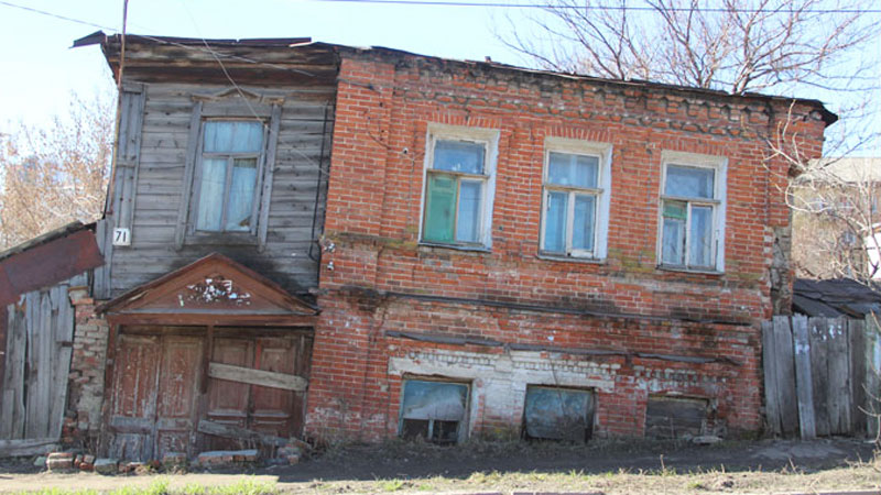 5. Следующий за ним дом №71 и вовсе «прилег» на бок и вот-вот сложится. Фасад постепенно разрушается, часть кирпичей из него уже отвалилась, образовав выступ под крышей здания, который того и гляди упадет.