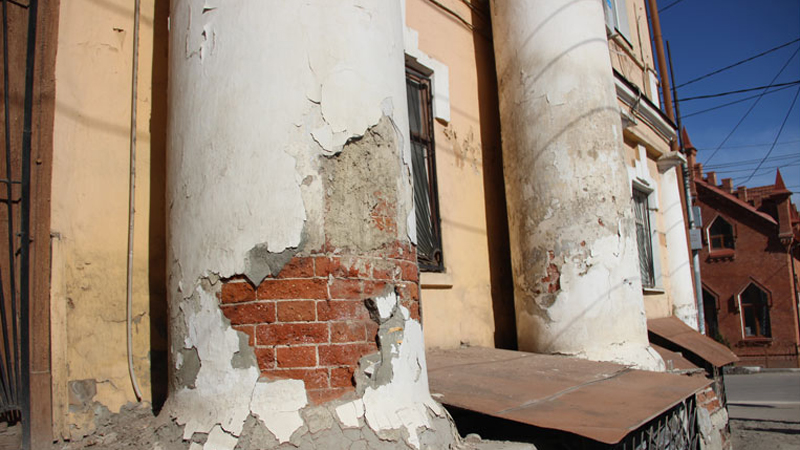 8. Опасен для пеших прогулок и дом №178 по Чернышевского. С его фасада активно осыпается штукатурка. Часть ее еле держится на кирпичной кладке, которая также серьезно разрушена и тоже вскоре посыпется.