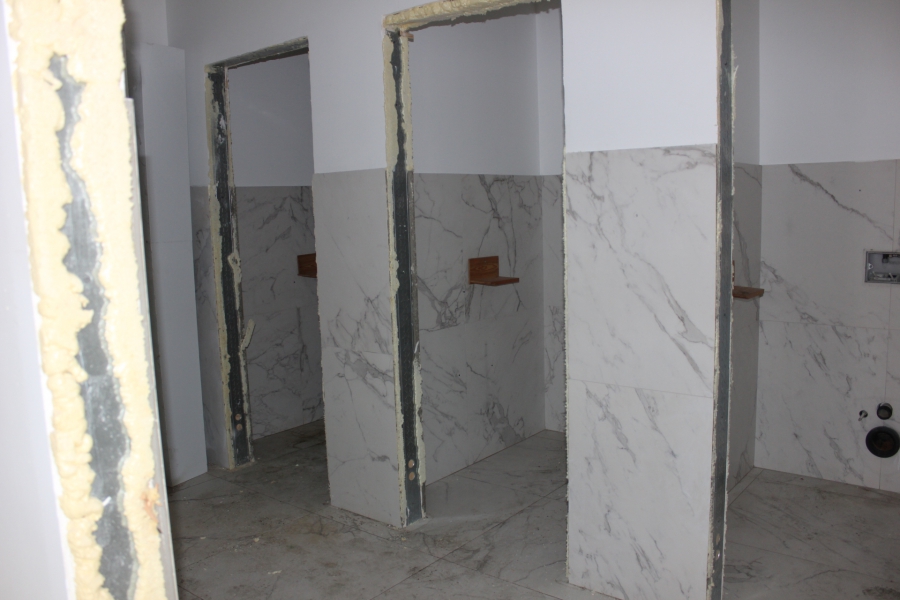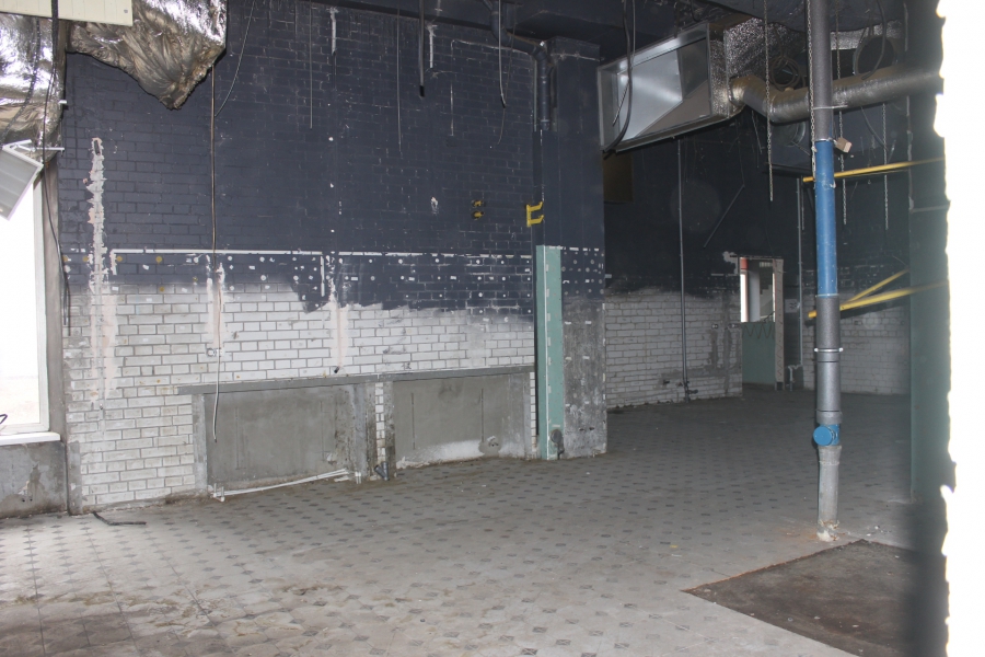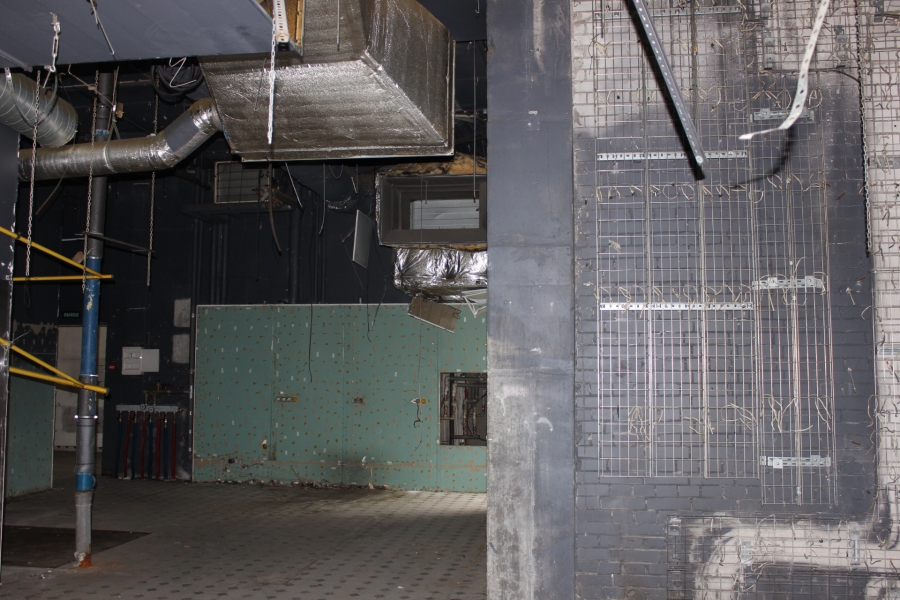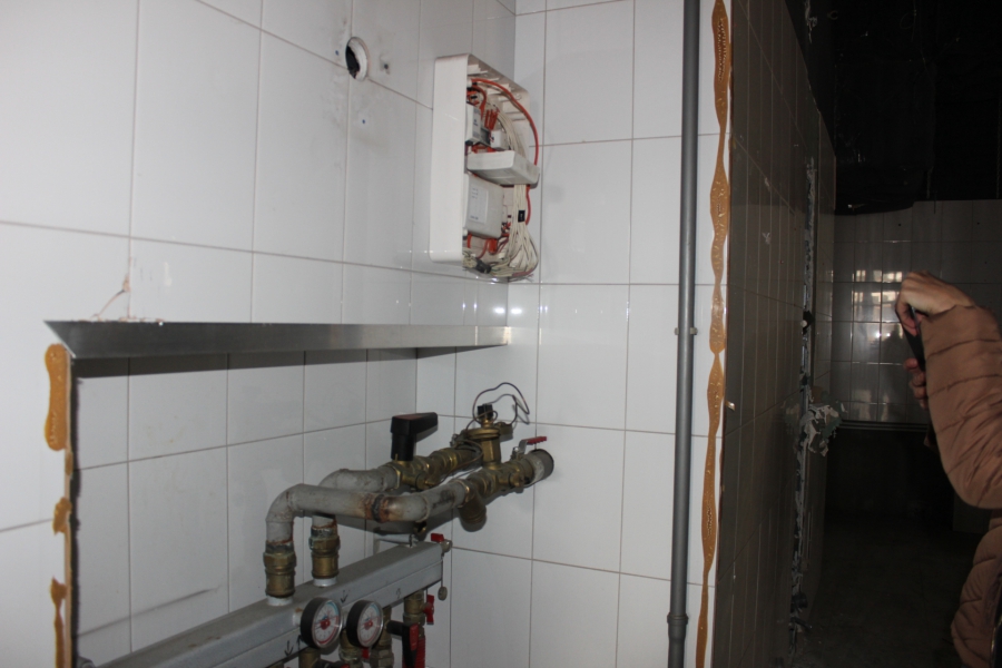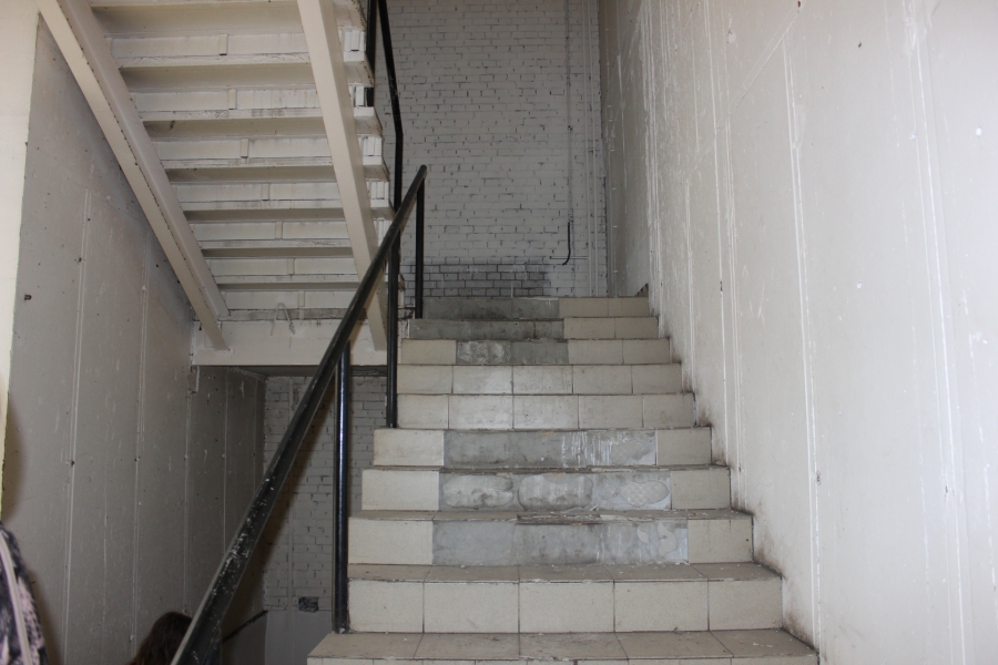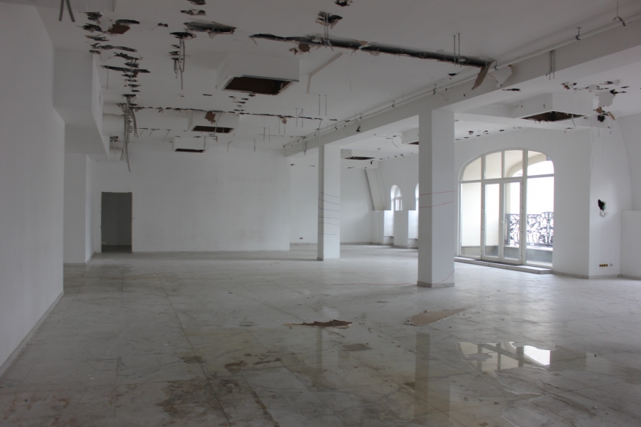 Здание достаточно внушительное по своим размерам, там четыре этажа, присутствует также лифт. При этом оно пребывает в удручающем состоянии. Относительно целым остался санузел на первом этаже, уцелела плитка, но коммуникации для проведения жилищно-коммунальных услуг потребуется заменить: в здании нет ни освещения, ни системы вентиляции, многие розетки просто вырваны из стен, а с потолка висят провода. Особенно остро ощущается отсутствие отопления – в помещениях холоднее, чем на улице. Цокольный этаж был приспособлен под парковку. На верхнем этаже наблюдается подтопление, однако пока что не понятно, в чем кроется причина, поскольку видимых следов течи с крыши нет.